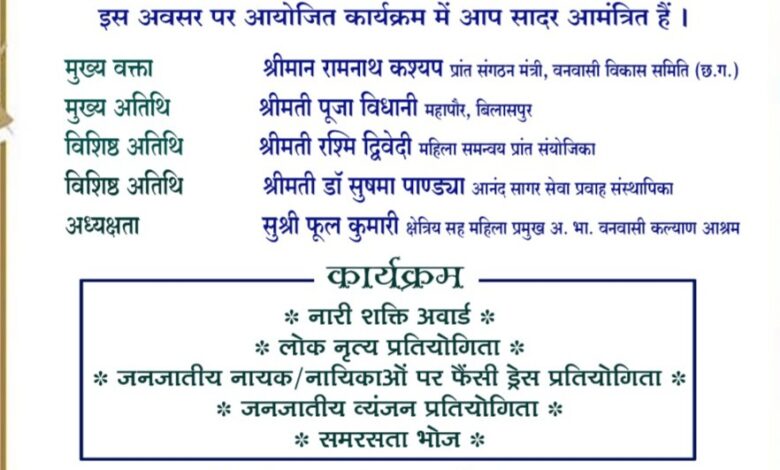 बिलासपुर–अखिल भारतीय वनवासी कल्याण आश्रम के योजना से 26 जनवरी 2026 को नारी शक्ति दिवस का आयोजन वीरांगना रानी माँ गाइदिन्ल्यू की जयंती के उपलक्ष्य में किया जा रहा है।उक्त कार्यक्रम दोपहर 12 बजे से सरस्वती शिशु मंदिर, तिलक नगर, में आयोजित होगा। पिछले चार वर्षों से बिलासपुर महिला समिति के द्वारा यह प्रतियोगिता आयोजित की जा रही है समिति की बहने पिछले 12 वर्षों से सक्रियता से जनजाति समाज की बहनों के सर्वांगीण विकास के उद्देश्य को ध्यान में रखकर विभिन्न गतिविधि एवं कार्यक्रमों के माध्यम से कार्य कर रही हैं ।कार्यक्रम के अंतर्गत नारी शक्ति अवार्ड, लोकनृत्य प्रतियोगिता, जनजातीय नायक-नायिकाओं पर फैंसी ड्रेस प्रतियोगिता,जनजातीय व्यंजन प्रतियोगिता एवं समरसता भोज का आयोजन किया जाएगा।यह आयोजन जनजातीय संस्कृति का संरक्षण एवं जनजातीय नायक नायिकाओं का समाज से परिचय हेतु समर्पित है।नारी शक्ति दिवस के कार्यक्रम में शहर की सभी मातृशक्ति का स्वागत हैकार्यक्रम बिलासपुर महिला समिति द्वारा आयोजित किया जा रहा है।