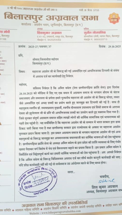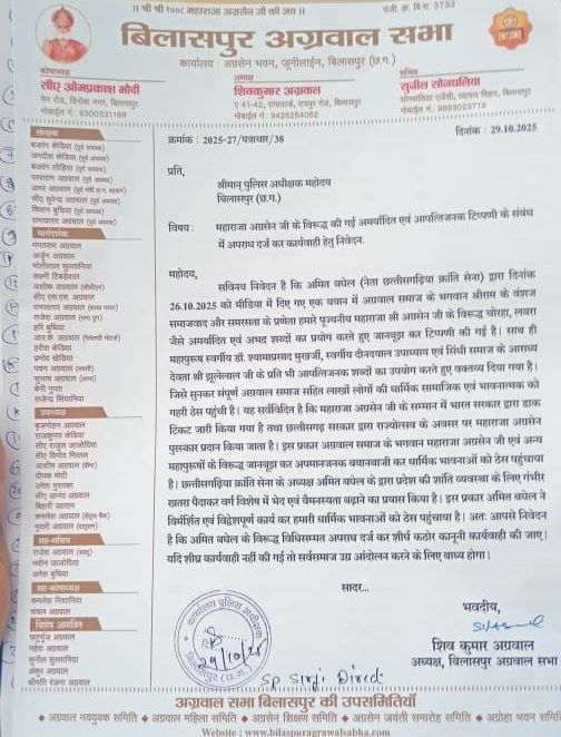 अग्रवाल सभा के अध्यक्ष शिव अग्रवाल ने कहां है कि छत्तीसगढ़िया क्रांति सेना के अमित बघेल ने महाराजा अग्रसेन जी के खिलाफ अशोभनीय एवं अमर्यादित शब्दों का उपयोग करते हुए जानबूझकर टिप्पणी की है। जिसे अग्रवाल सभा में काफी आक्रोश है।