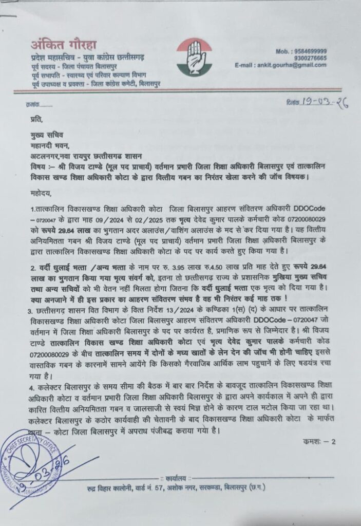 बिलासपुर / जिला शिक्षा विभाग पर गंभीर और बहुस्तरीय भ्रष्टाचार के आरोप लगे हैं। युवा कांग्रेस के प्रदेश महासचिव अंकित गौरहा ने प्रदेश के प्रमुख सचिव से मुलाकात कर प्रभारी जिला शिक्षा अधिकारी विजय टांडे और स्थापना शाखा के जूनियर ऑडिटर सुनील यादव के खिलाफ विस्तृत लिखित शिकायत सौंपी है। शिकायत में वित्तीय गबन,अनुकंपा नियुक्ति में फर्जीवाड़ा,युक्तियुक्तकरण में नियमों की अनदेखी और प्रशासनिक प्रक्रिया को दरकिनार कर फैसले लेने जैसे कई गंभीर आरोप दर्ज किए गए हैं।