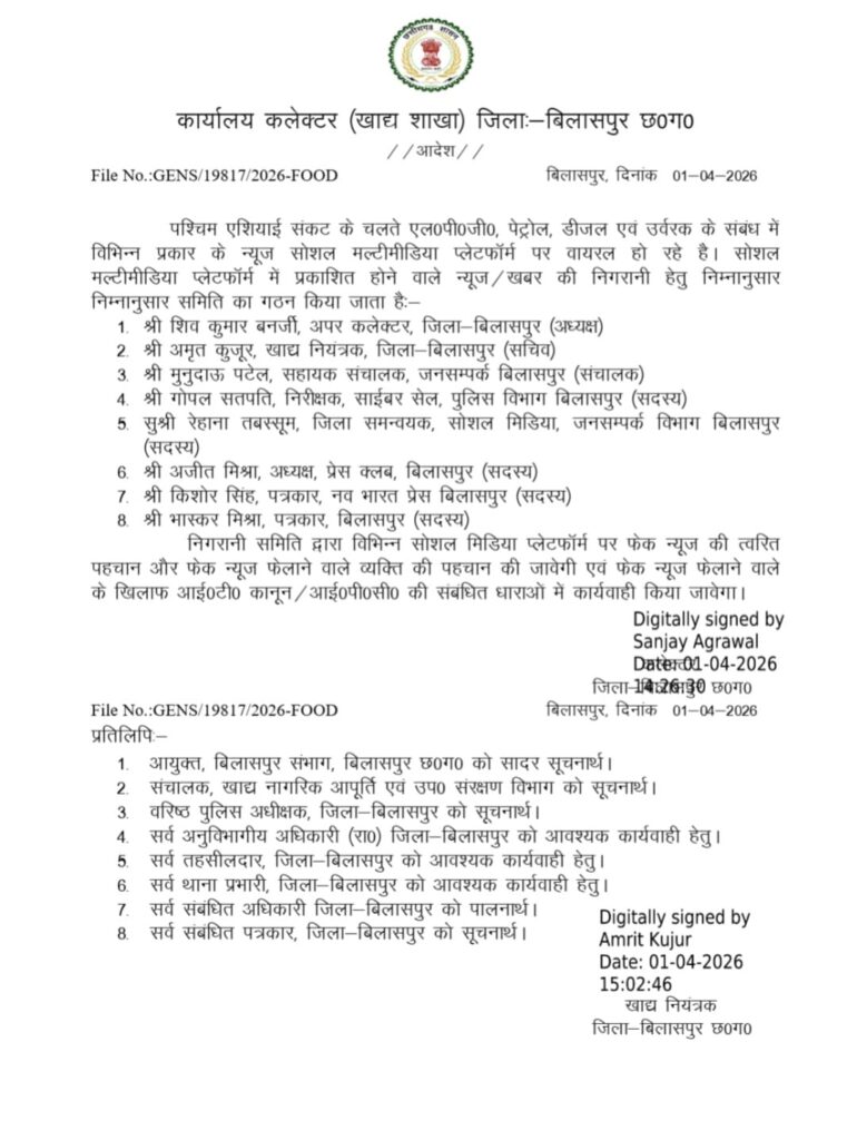 बिलासपुर/ पश्चिम एशिया में उत्पन्न परिस्थितियों के बीच एलपीजी, पेट्रोल, डीजल एवं उर्वरक की उपलब्धता को लेकर सोशल मीडिया पर भ्रामक खबरों के प्रसार को गंभीरता से लेते हुए जिला प्रशासन ने कड़ा कदम उठाया है। कलेक्टर संजय अग्रवाल के निर्देश पर सोशल मीडिया प्लेटफॉर्म्स पर प्रसारित होने वाली खबरों की निगरानी के लिए एक विशेष समिति का गठन किया गया है।