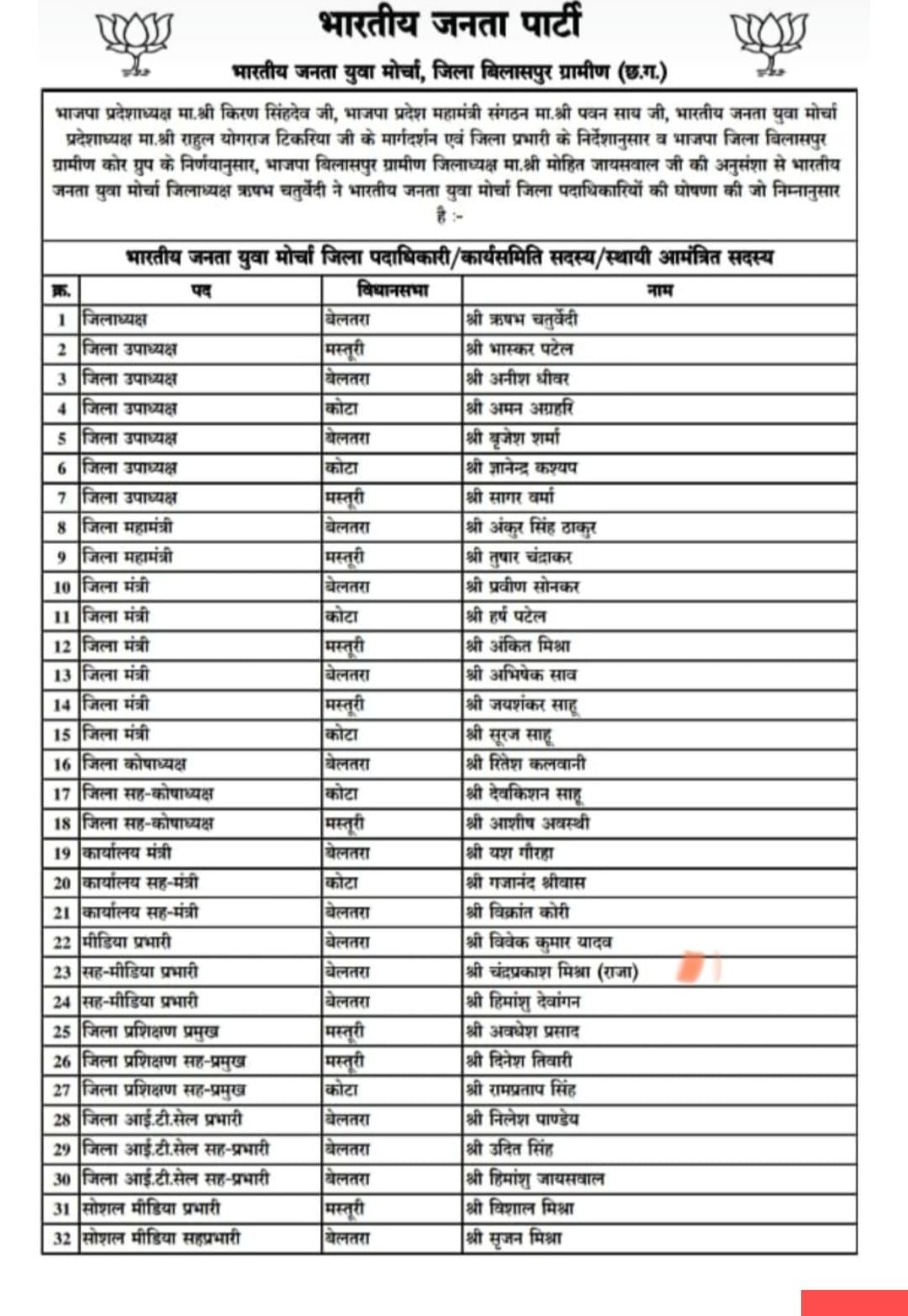 बिलासपुर–भारतीय जनता पार्टी जिला ग्रामीण संगठन ने युवा मोर्चा के जिला इकाई एवम मण्डल अध्यक्षों व महामंत्रियों की विधिवत घोषणा की है भाजपा जिला अध्यक्ष ग्रामीण के अनुमोदन पश्चात युवा मोर्चा जिलाध्यक्ष ने जिला पदाधिकायो, कार्यसमिति सदस्यों व विभिन मण्डलो के अध्यक्ष वा महामंत्रियों की पद की सूची जारी की।