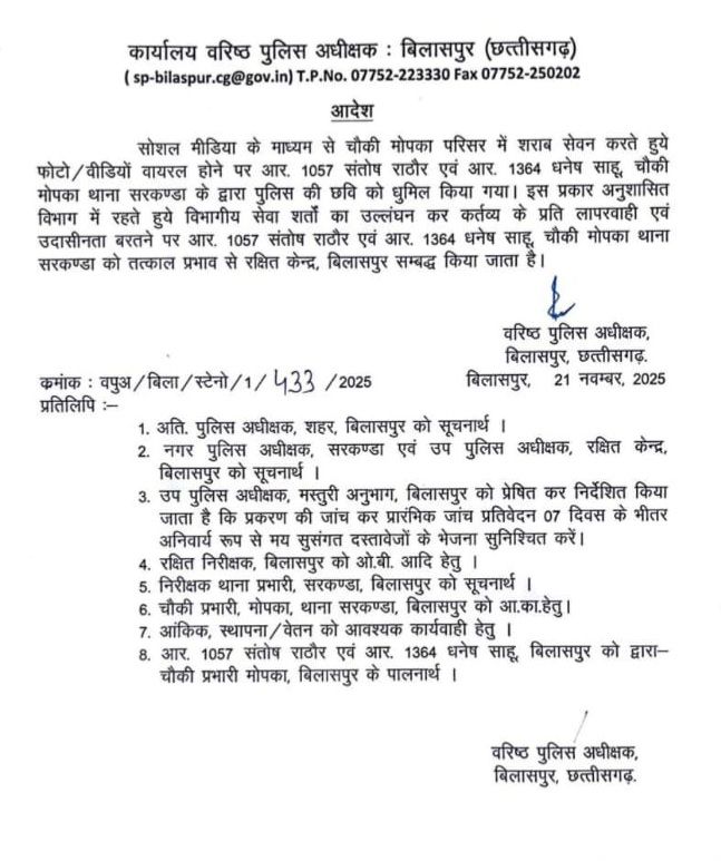 बिलासपुर–सरकंडा थाना क्षेत्र की मोपका पुलिस चौकी एक बार फिर विवादों में आ गई है। चौकी के भीतर ड्यूटी के दौरान शराब पीते पुलिसकर्मियों का वीडियो सोशल मीडिया पर सामने आया, जिसके बाद पुलिस महकमे में हड़कंप मच गया। मामले को गंभीरता से लेते हुए एसएसपी रजनेश सिंह ने त्वरित कार्रवाई करते हुए चौकी में तैनात दो आरक्षकों को लाइन अटैच कर दिया।