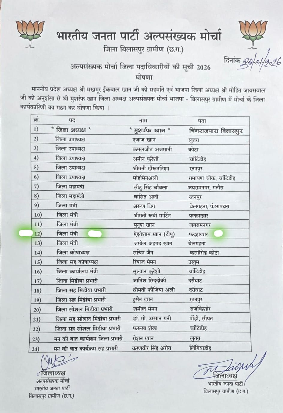 बिलासपुर–भारतीय जनता पार्टी भाजपा अल्पसंख्यक मोर्चा के प्रदेश अध्यक्ष मखमूर इक़बाल खान की सहमति एवं भाजपा जिला अध्यक्ष मोहित जयसवाल की अनुशंसा से मुशरफ खान जिला अध्यक्ष अल्पसंख्यक मोर्चा भाजपा-बिलासपुर ग्रामीण से जिला मंत्री एहतेशाम टीपू खान की नियुक्ति की है।