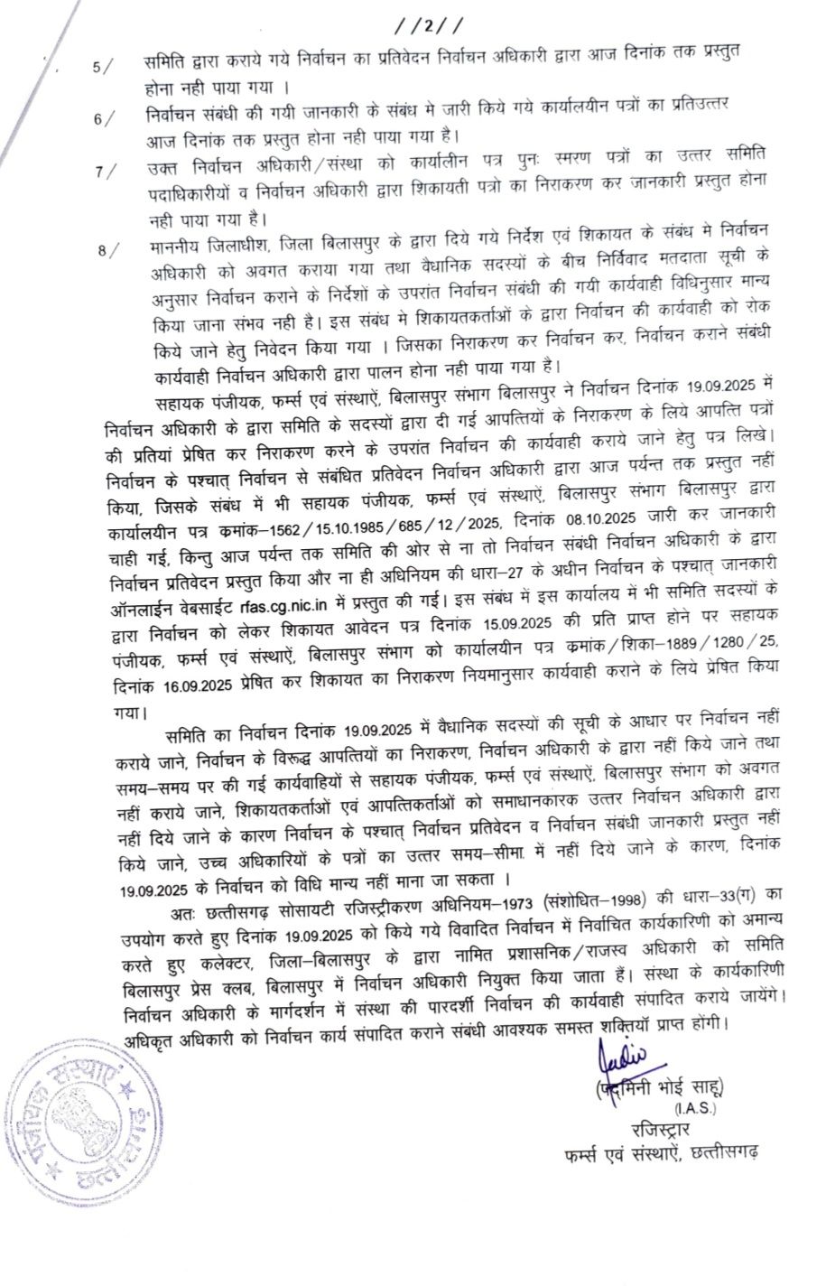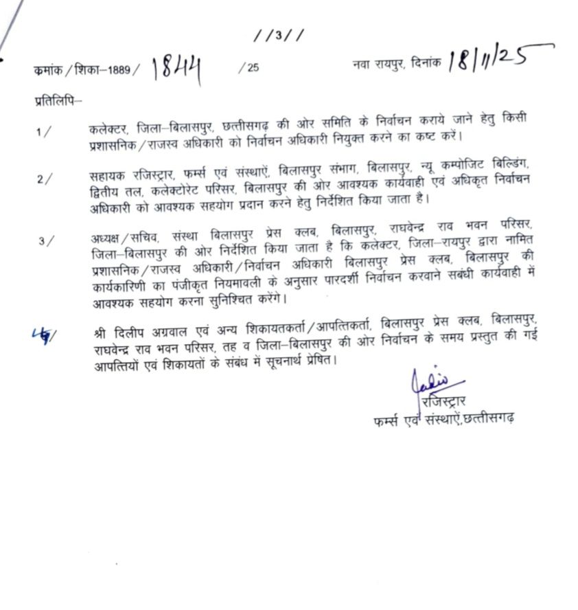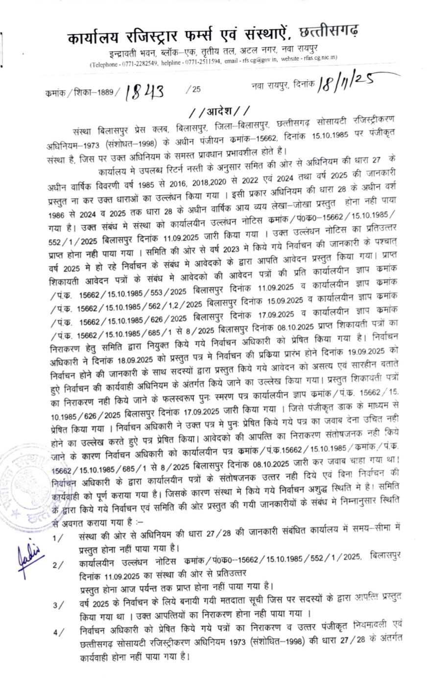 रायपुर/बिलासपुर–रजिस्ट्रार फर्म्स एवं संस्थाएँ, छत्तीसगढ़ द्वारा छत्तीसगढ़ सोसायटी रजिस्ट्रीकरण अधिनियम 1973 के अंतर्गत पंजीकृत प्रेस क्लब बिलासपुर की निर्वाचित कार्यकारिणी को दिनांक 19 सितंबर 2025 को आयोजित विवादित चुनाव में पाई गई अनियमितताओं के आधार पर निरस्त कर दिया गया है। रजिस्ट्रार श्री भोई साहू (IAS) द्वारा 18 नवंबर 2025 को जारी आदेश के अनुसार उक्त चुनाव को विधि अनुसार अमान्य घोषित किया गया है।