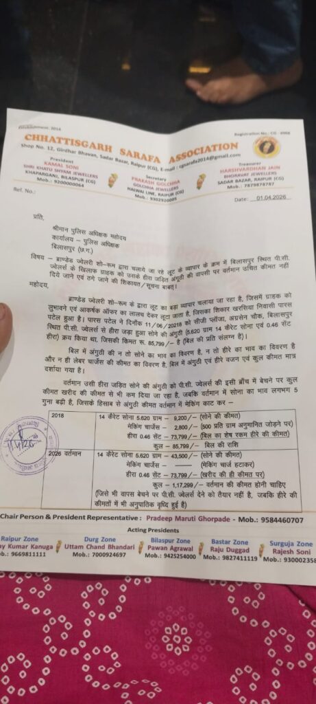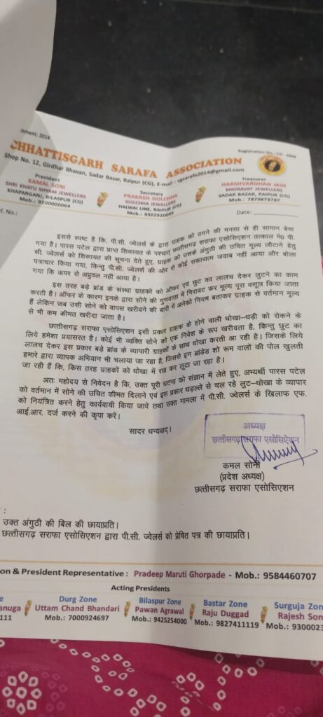 बिलासपुर/ अग्रसेन चौक में स्थित ब्रांडेड ज्वेलरी शोरूम, पी.सी. ज्वैलर्स, विवादों के घेरे में आ गया है। छत्तीसगढ़ सराफा एसोसिएशन ने शोरूम पर ग्राहकों को ठगने और आभूषणों की वापसी (बायबैक) पर वर्तमान बाजार दर के अनुसार भुगतान न करने का गंभीर आरोप लगाया है। इस संबंध में एसोसिएशन के प्रदेश अध्यक्ष कमल सोनी ने बिलासपुर पुलिस अधीक्षक को एक औपचारिक शिकायत पत्र सौंपकर कार्रवाई की मांग की है।