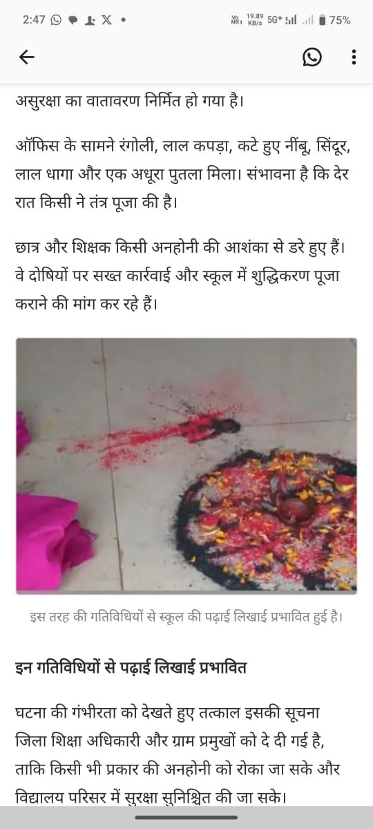 कोंडागांव–छत्तीसगढ़ के कोंडागांव जिले के ग्राम करंजी स्थित शासकीय उच्चतर माध्यमिक विद्यालय में उस वक्त हड़कंप मच गया, जब स्कूल परिसर में कथित तांत्रिक गतिविधि से जुड़ा सामान बरामद हुआ। प्रिंसिपल कार्यालय के ठीक सामने लाल कपड़ा, कटे नींबू, सिंदूर, लाल धागा, अधूरा पुतला और जमीन पर बने रहस्यमयी प्रतीकों जैसी रंगोली मिलने से शिक्षक, छात्र और स्टाफ सहम गए।