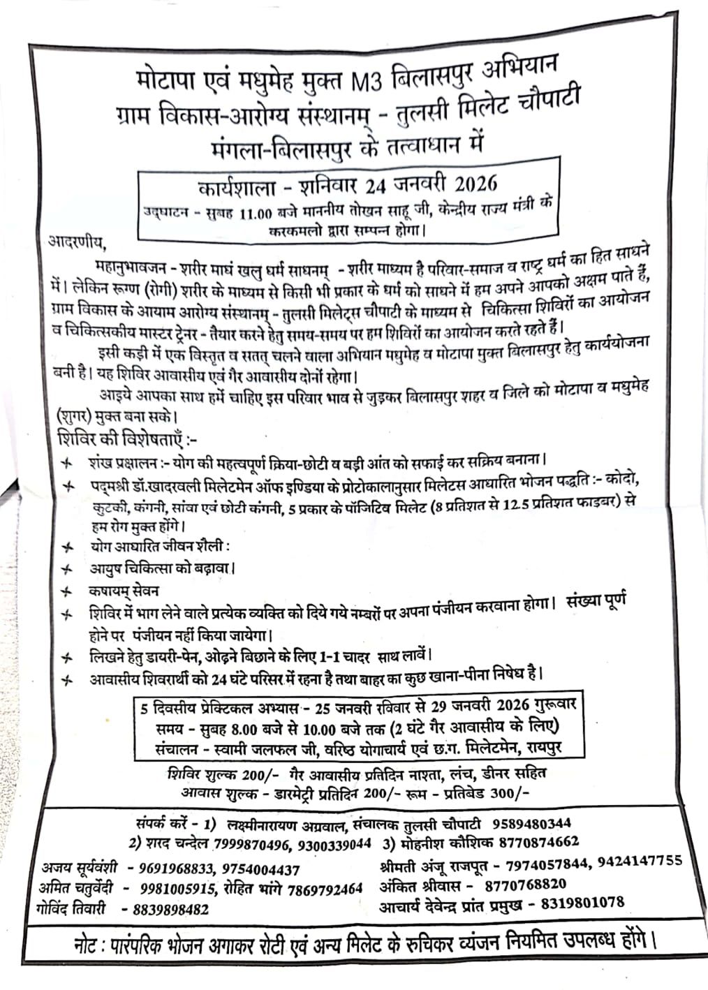मिलेटस आधारित भोजन पद्धति कोदो, कुटकी, कंगनी, सांवा एवं छोटी कंगनी, 5 प्रकार के पॉजिटिव मिलेट के सेवन से रोग को मुक्त करेंगे। इस शिविर का उदेश्य योग आधारित जीवन शैली,आयुष चिकित्सा को बढ़ावा और कषायम् सेवन करना है। यह कार्यशाला सुबह 8 बजे से रात 10 बजे तक चलेगा जिसमें शामिल आवासीय लोगों को वही पांच दिनों तक रहना पड़ेगा। इस शिविर को सफल बनाने में लक्ष्मीनारायण अग्रवाल,मोहनीश कौशिक, शरद चंदेल,अजय सूर्यवंशी,अमित चतुर्वेदी,गोविंद तिवारी,अंजू राजपूत,अंकित श्रीवास सहित अन्य लाेग जुटे है।