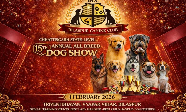 बिलासपुर– केनाइन क्लब के तत्वावधान में छत्तीसगढ़ राज्य स्तरीय 15वां एनुअल ऑल ब्रीड डॉग शो का भव्य आयोजन दिनांक 1 फरवरी 2026 को त्रिवेणी भवन, व्यापार विहार, बिलासपुर में किया जाएगा। इस प्रतिष्ठित डॉग शो में देश एवं प्रदेश के विभिन्न हिस्सों से आने वाले उत्कृष्ट, अनुशासित एवं प्रशिक्षित डॉग्स अपनी प्रतिभा का प्रदर्शन करेंगे।