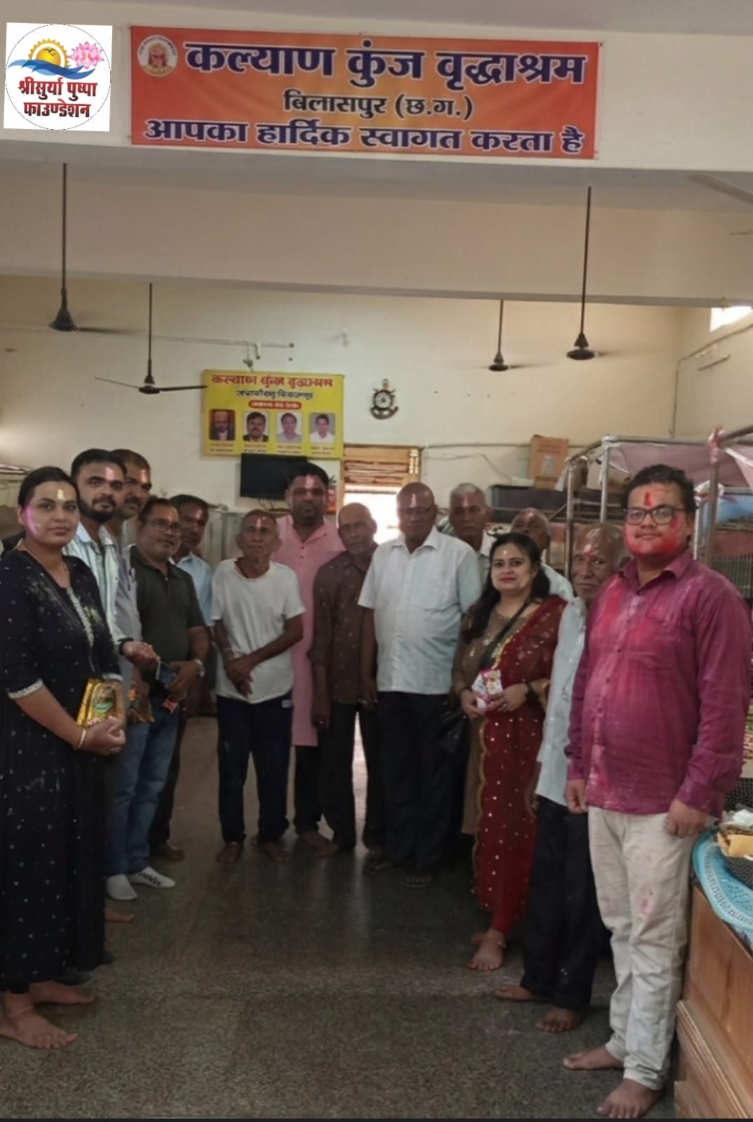 बिलासपुर–श्रीसूर्या पुष्पा फाउंडेशन परिवार के द्वारा होली मिलन कल्याणकुंज वृद्धाश्रम मसानगंज में रखा गया।जिसमें संस्था के सभी सदस्यों ने बढ़ चढ़कर हिस्सा लिए।बुजर्ग माताओं और पुरुषों के द्वारा होली खेली गई और सभी के चेहरों पर हर्बल गुलाल/रंग का टीका लगाकर आशीर्वाद लिया गया। तत्पश्चात सभी को जूस देकर बुजुर्गों से आशीर्वाद लिया गया।
