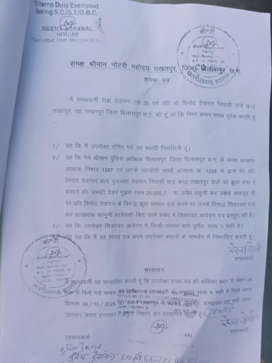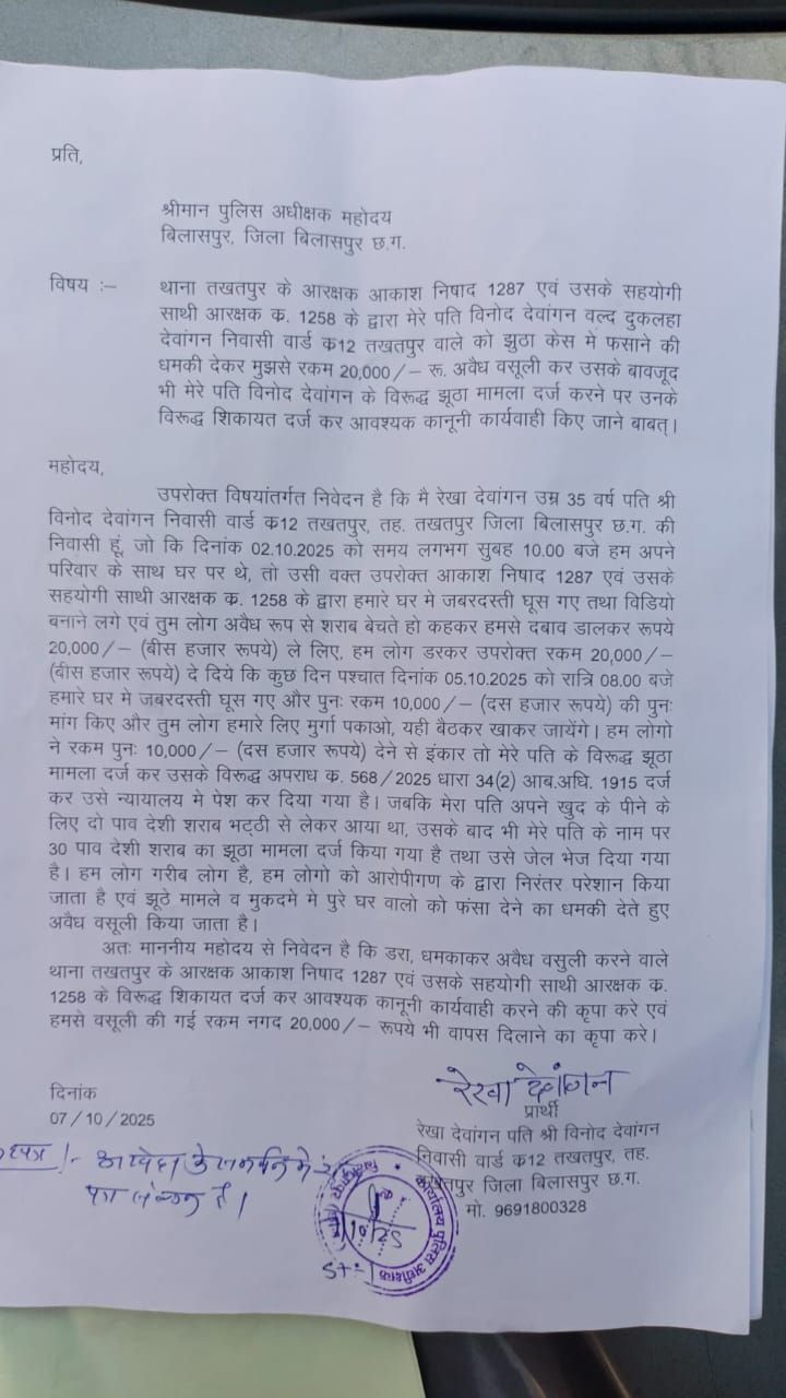 सीपत थाने का मामला ठंडा भी नहीं हुआ था कि तखतपुर थाने में पदस्थ आरक्षक आकाश निषाद (क्रमांक 1287) पर वार्ड क्रमांक 12 की एक महिला ने गंभीर आरोप लगाए हैं। महिला का कहना है कि आरक्षक ने जबरन घर में घुसकर अवैध वसूली की और पैसे न देने पर उसके पति को झूठे शराब तस्करी के केस में फंसा दिया। महिला ने इस संबंध में पुलिस अधीक्षक को लिखित शिकायत दी है और शपथ पत्र भी सौंपा है।