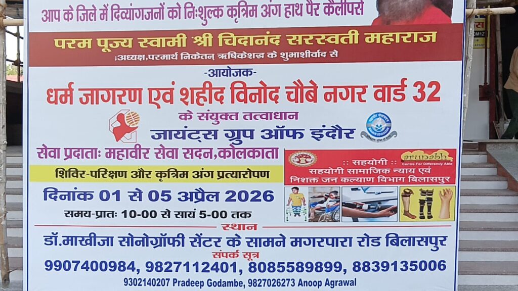धर्म जागरण समन्वय और वार्ड क्रमांक 32 शहीद विनोद चौबे नगर के संयुक्त तत्वावधान में आयोजित इस शिविर में बिलासपुर के साथ-साथ रायगढ़, बाराद्वार, बेमेतरा और चिरमिरी से भी बड़ी संख्या में दिव्यांगजन पहुंचे। कृत्रिम अंग प्राप्त करने के बाद उनके चेहरों पर खुशी और संतोष साफ झलकता नजर आया।