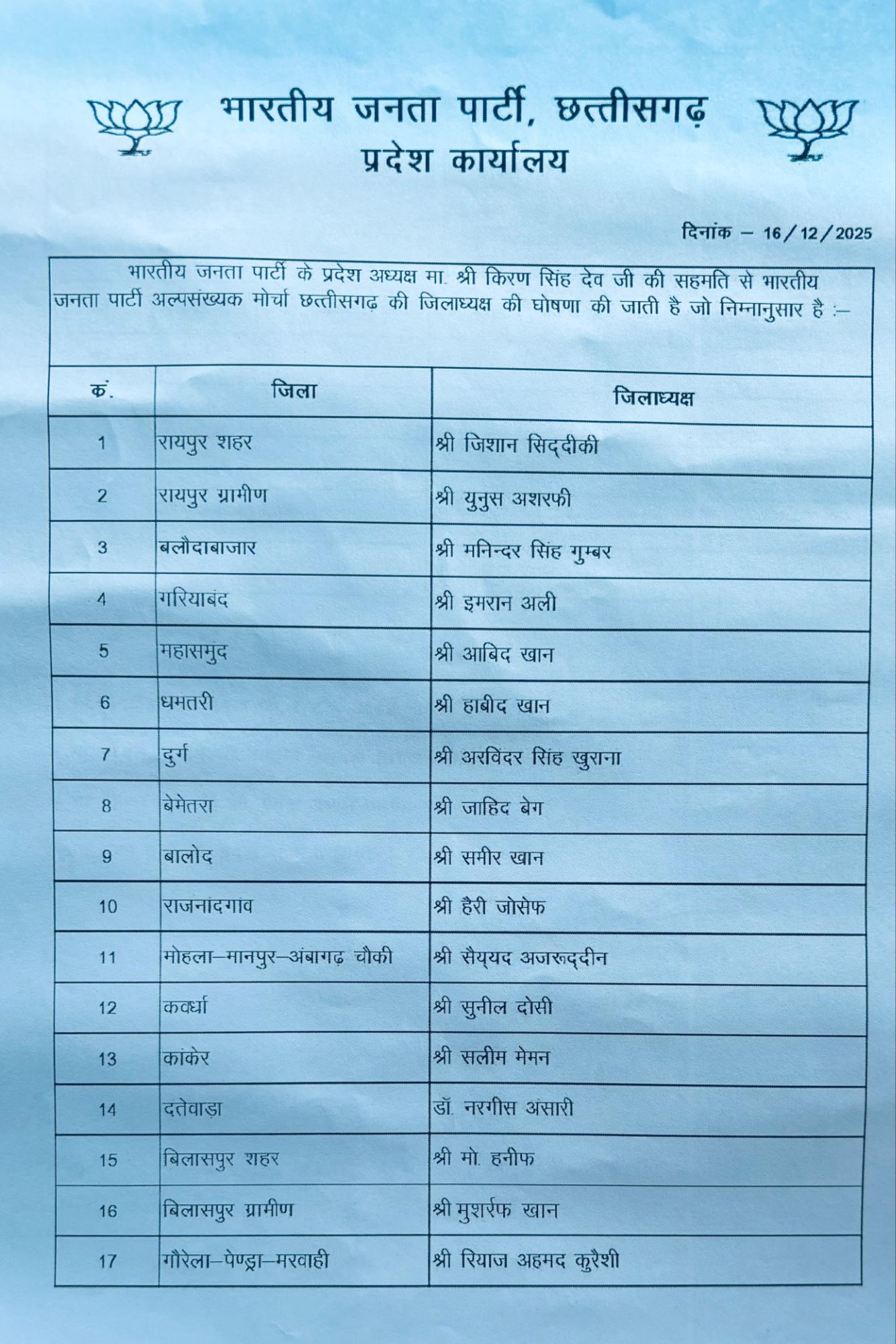 बिलासपुर–भारतीय जनता पार्टी ने संगठन मे कसावट लाते हुए,भारतीय जनता पार्टी के प्रदेश अध्यक्ष किरण सिंह देव की सहमति से प्रदेश अध्यक्ष बीजेपी अल्पसंख्यक मोर्चा के मखमूर इक़बाल खान के द्वारा प्रदेश अल्पसंख्यक मोर्चा के जिलाध्यक्ष की सूची जारी की गई।नव नियुक्त जिलाध्यक्ष की सूची मे बिलासपुर जिला को दो भाग मे बाटते हुए बिलासपुर शहर और बिलासपुर ग्रामीण मे दो जिलाध्यक्ष की नियुक्ति करते हुए बिलासपुर शहर से मोहम्मद हनीफ को जिम्मेदारी दी गई वही बिलासपुर ग्रामीण से मुशरफ खान को जिलाध्यक्ष बनाया गया हैं। विदित हो की बेलतरा विधायक के कटटर समर्थक के रूप मे पहचाने जाने वाले मुसरफ खान लगभग 15 साल से निष्ठावान कार्यकर्ता के रूप मे अपनी सेवा देते आ रहे हैं।