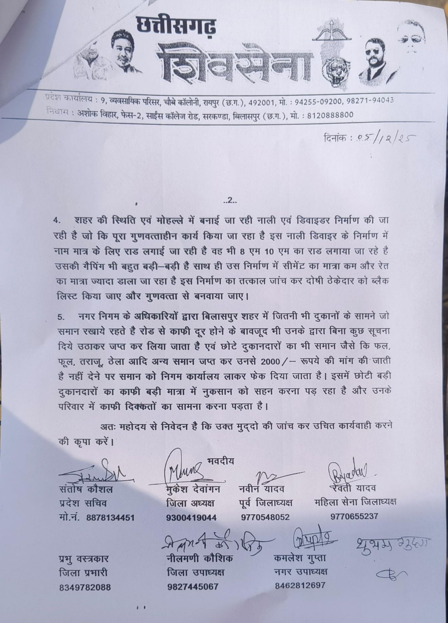 (4) शहर की स्थित एवं मोहल्ले में बनाई जा रही नाली एवं डिवाइड निर्माण की जा रही है जो कि पूरा गुणवत्ताहीन कार्य किया जा रहा है इस नाली डिवाइडर के निर्माण में नाम मात्र के लिए राड लगाई जा रही है वह भी 8 M 10 M का राड लगाया जा रहे हैं उसकी गैपिंग भी बहुत बड़ी-बड़ी है साथ ही उस निर्माण में सीमेंट का मात्रा कम और रेत का मात्रा ज्यादा डाला जा रहा हैं इस निर्माण का तत्काल जांच कर दोषी ठेकेदार को ब्लैक लिस्ट किया जाए। और गुणवत्ता से बनवाया जाए । (5)नगर निगम द्वारा रोड के साइड में लगे छोटे दुकानदारों का सामान निगम प्रशासन द्वारा जप्त किया जाता है एवं दुकानों से ₹2000 चालन लिया जाता है जो की बहुत ही गलत है जो रोड के किनारे में है उनको भी परेशान किया जाता है इसके साथ ही फल ठेला लगाने वाले व्यापारियों को लगातार निगम प्रशासन द्वारा परेशान किया जा रहा है और उनका सामान सहित ठेला जब किया जाता है जबकि फल ऐसा चीज है एक से दो दिन में खराब हो जाते हैं इसमें छोटे लोगों को भारी नुकसान उठाना पड़ता है इसको बंद किया जाए। ज्ञापन सौंपने वालों में संतोष कौशल प्रदेश सचिव , मुकेश देवांगन जिला प्रमुख, नवीन यादव पूर्व जिला प्रमुख, रेवती यादव जिला प्रमुख महिला सेना, नीलमणि कौशिक जिला उप प्रमुख, कमलेश गुप्ता नगर उप प्रमुख, शुभम गुप्ता आदि शिव सैनिक उपस्थित थे।
