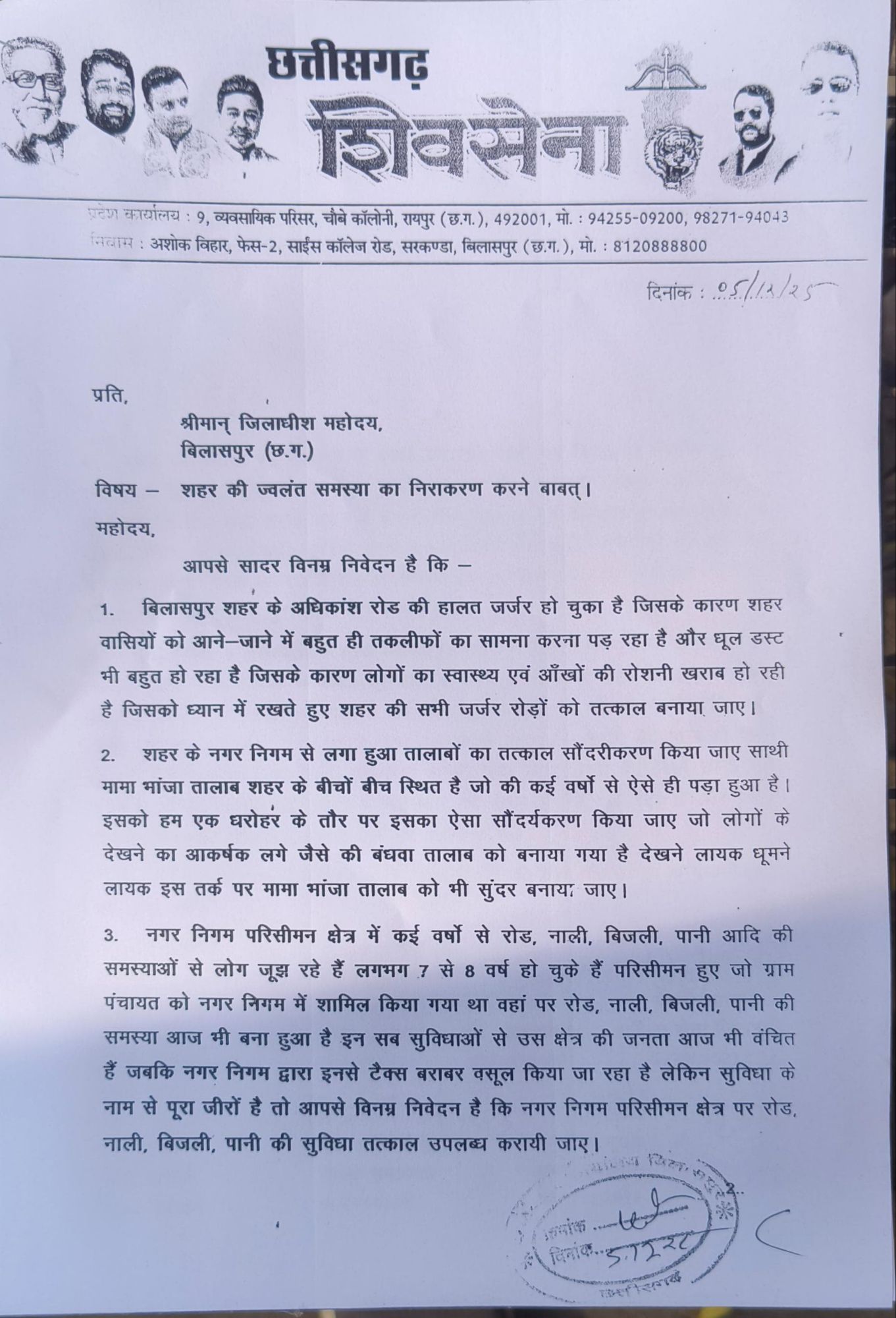 बिलासपुर–शिवसेना जिला इकाई द्वारा जनहित के मुद्दों पर शिवसेना के जिला प्रमुख मुकेश देवांगन के नेतृत्व में शिवसेना के प्रतिनिधि मंडल द्वारा जिलाधीश महोदय से मिलकर शहर के जनहित के मुद्दों पर ज्ञापन दिया गया।उक्त ज्ञापन में मुख्य रूप से शहर की मूलभूत मांगे रखी गई है।