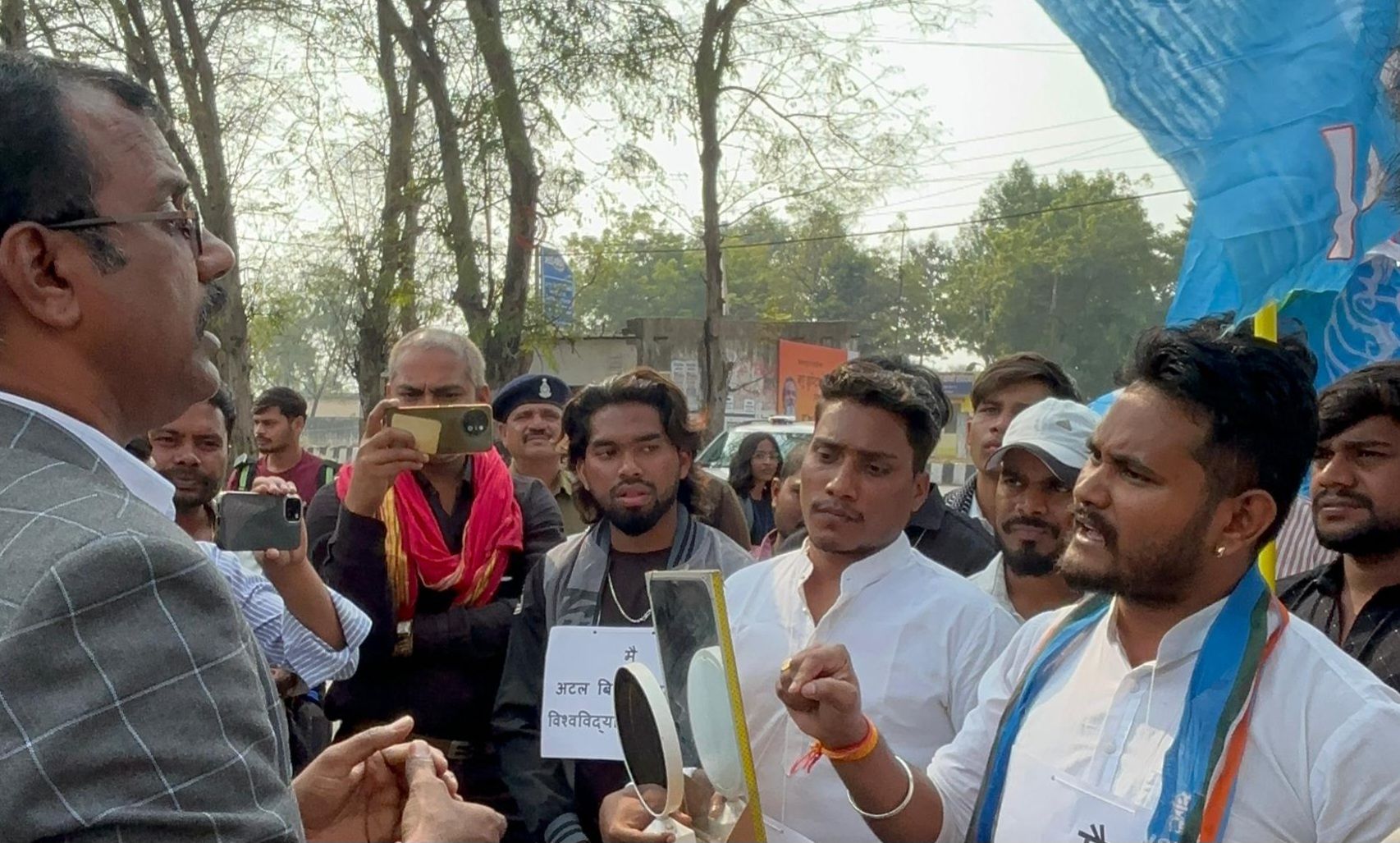अटल विश्वविद्यालय में गूंजा छात्र आक्रोश….. एनएसयूआई ने बाजे–गाजे के साथ खोला अनियमितता का काला चिट्ठा… 48 घंटे की निविदा, पहले से लगा डोम… एनएसयूआई का आरोप—‘यह टेंडर नहीं, सेटिंग का खेल…..
