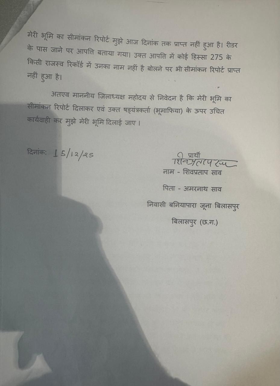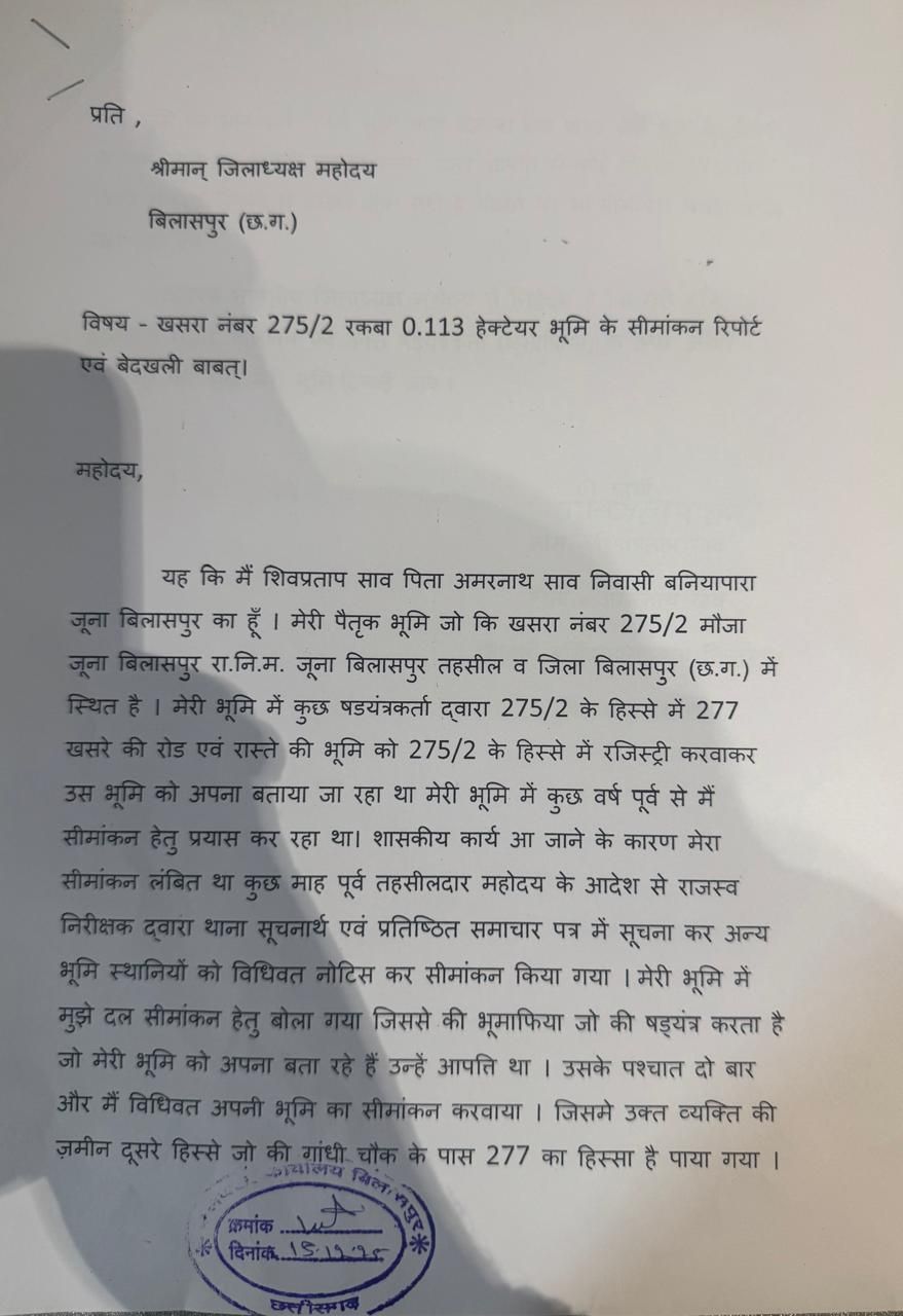 कलेक्टर को दिए गए आवेदन को दरकिनार करने वाले तहसीलदार प्रकाश साहू की वर्किंग बिलासपुर तहसील में चर्चा का विषय बन गई है वर्तमान मे तहसील कार्यालय में सीमांकन प्रकरण को नस्ती करने के बजाय उसे अनावशयक रोका जा रहा है।मौजा जूना बिलासपुर हल्का के करबला स्थित खसरा नंबर 275/2 मे रकबा 0.1130 हेक्टेयर भूमि आवेदक शिव प्रताप साव के नाम पर दर्ज है जिसका सीमांकन बीते 15 अक्टूबर 2025 को 7 सदस्यीय आर आई – पटवारी की टीम द्वारा किया गया सीमांकन में चिमन रावलानी द्वारा खसरा नंबर 275 के कुछ हिस्से मे कब्जा करना पाया गया गांधी चौक के पास स्थित चौधरी मोहल्ला के आसपास का खसरा नंबर 277 को चिमन रावलानी चार टुकड़े में रजिस्ट्री कर खसरा नंबर 275 मे काबिज है टेंट का व्यवसाय करने वाले चिमन रावलानी द्वारा नगर निगम को भी गलत जानकारी देते हुए बिल्डिंग का नक्शा पास कराना पाया गया शासन को धोखे में रखने किए गए।अवैधानिक कृत्य की सीमांकन मे पोल खुलता देख चिमन रावलानी तहसील में आपत्ति दर्ज कराने पहुंचा चिमन रावलानी की रीडर से भेंट के बाद दुसरे खसरा की आपत्ति को तहसीलदार प्रकाश साहू द्वारा सहर्ष दर्ज कर लिया गया।तहसीलदार प्रकाश साहू का सानिध्य पाकर पूर्व सीमांकन रिपोर्ट को दबाना और नया सीमांकन कराकर जमीन को विवादित बनाने की मंशा लेकर चल रहा चिमन रावलानी शुक्रवार 2 जनवरी को हुए सीमांकन में भी मौके पर पहुंची टीम को आपत्ति आवेदन प्रस्तुत किया और बताया कि आज के सीमांकन की जानकारी उन्हें 2 घंटे पूर्व हुई है और उनकी इस सीमांकन में आपत्ति पहले से दर्ज है। बहरहाल खसरा नंबर 275 की नाप जोख में जुटी टीम ने आवेदक की भूमि चिन्हाकिंत करने के लिए मौके पर टेप गिराना शुरू ही किया था कि तहसीलदार का फोन आते ही टीम स्थिर हो गई सीमांकन होल्ड करने के उद्देश्य से टीम के कुछ सदस्य अन्य कार्य का हवाला देते हुए मौके से निकल गए चंद मिनट में आधा अधूरा सीमांकन कार्य सम्पादित कर आरआई द्वारा पंचनामा तैयार किया गया टीम सीमांकन की केवल औपचारिकता होने वी खसरा नंबर 275 की भुजा को चारो दिशा से ना नापने पर आवेदक के पुत्र व अन्य ने हस्ताक्षर करने से इनकार कर दिया।