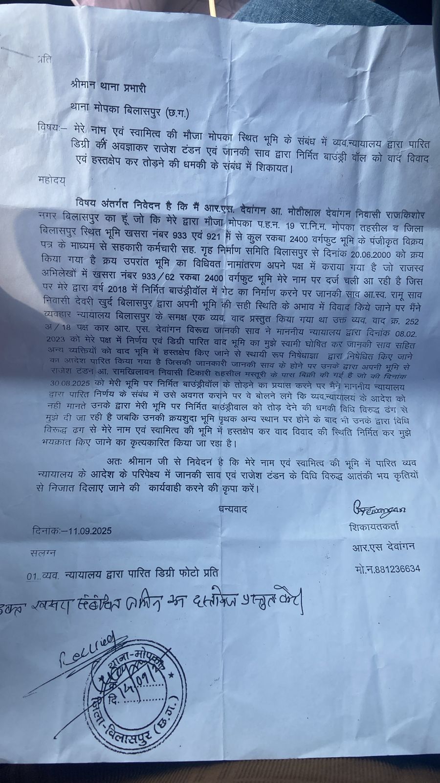 बिलासपुर–सरकंडा थाना और मोपका चौकी क्षेत्र में जमीन माफियाओं का आतंक किसी से छिपा नहीं है। ताज़ा मामला मोपका निवासी आर.एस. देवांगन की लिखित शिकायत से फिर उजागर हो गया है। शिकायत में साफ-साफ आरोप है कि न्यायालय के आदेशों को ताक पर रखकर, सरकारी दस्तावेज़ों की धज्जियाँ उड़ाकर और खुलेआम दीवार तोड़ने-गिराने की धमकियाँ देकर भू-माफिया जमीन कब्जाने पर आमादा हैं—और पुलिस? मानो सब कुछ आंखों के सामने होते देख भी अनजान बनी बैठी है।
